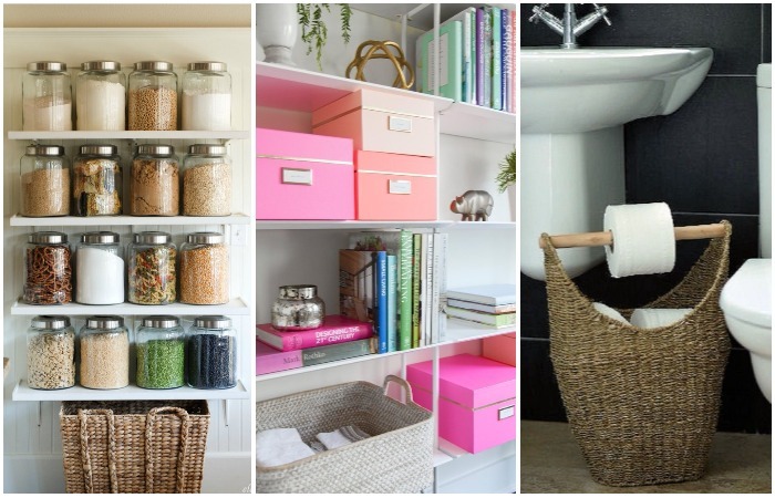 Они скроют от посторонних глаз всё лишнее, а заодно и скрасят интерьер. Только не забудьте пометить каждую специальным стикером или табличкой, чтобы точно не перепутать.