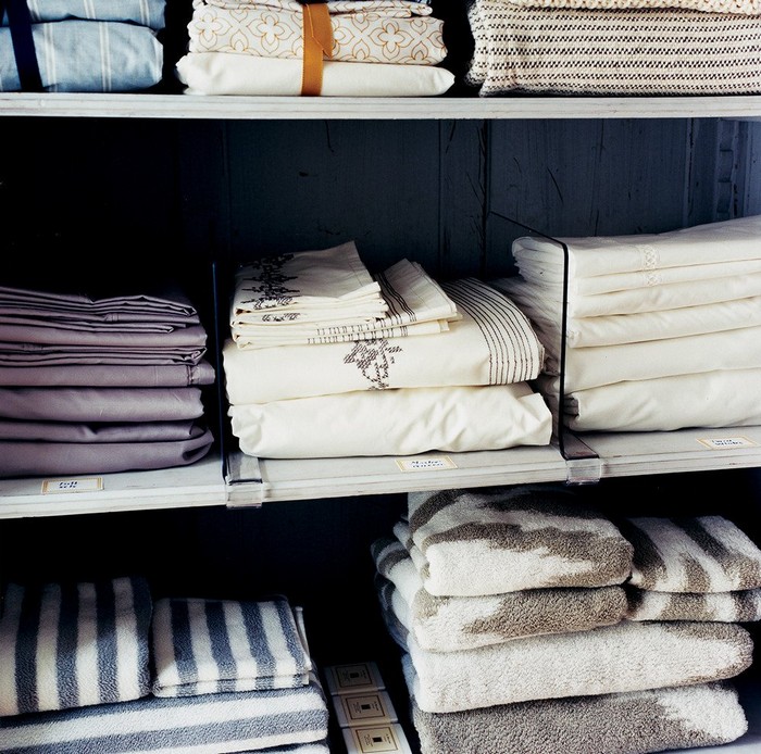 Как из одной длиндой полки сделать три, а то и четыре? Использовать специальные пластиковые разделители. Теперь хочешь-не хочешь, а придётся складывать одежду аккуратными стопками. Как в магазине.