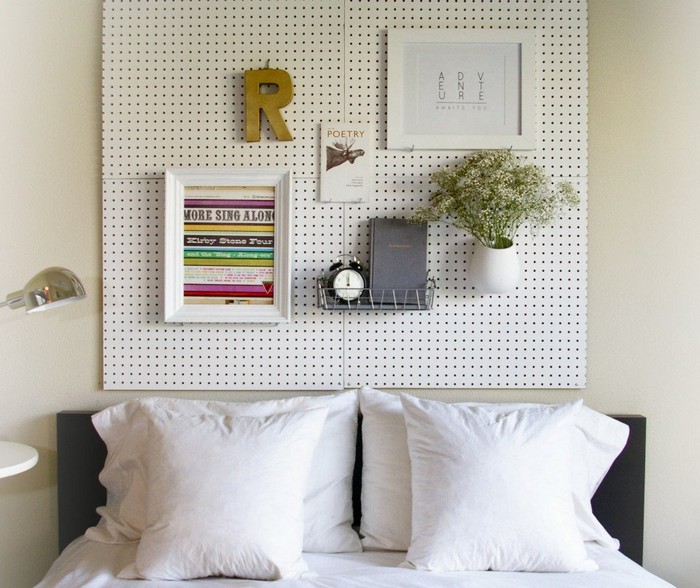 На перфорированную доску («pegboard») можно крепить не только листы с заметками и фото, как в детективных фильмах, но также небольшие полки и даже подвесные горшки с растениями. Притом на стене не останется никаких следов. Отличное решение для маленькой съёмной квартиры.