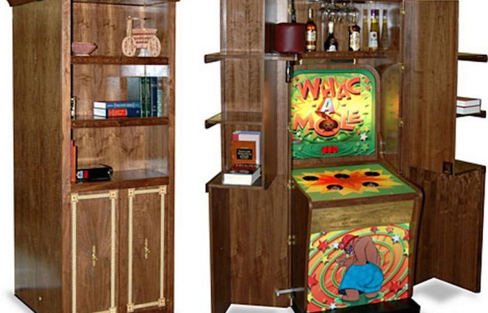 Вероятно, один из самых уродливых и самых устаревших предметов, которые можно купить за нелепую сумму, - это персональный бар Whac-A-Mole. Когда он закрыт, он выглядит как книжный шкаф в стиле 90-х годов, но когда открыть этот шкаф, то внутри обнаружится полностью рабочая игра 1970-х годов Whac-a-Mole со встроенным баром.
